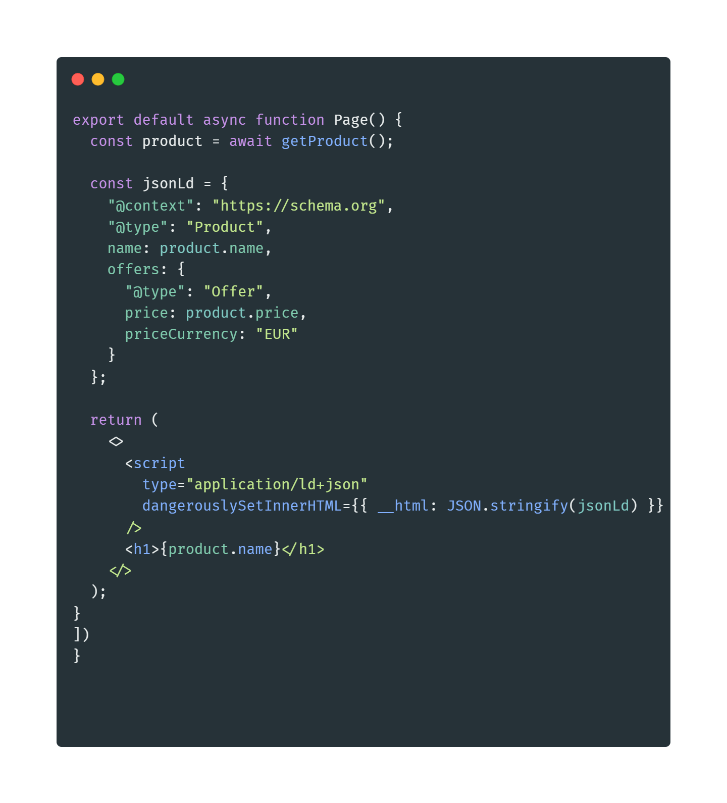 Con App Router puedes generar el schema directamente en el render del componente, como parte de la propia página, eso cambia el enfoque por completo, ya no estás “añadiendo SEO”, estás haciendo que el SEO forme parte del render.