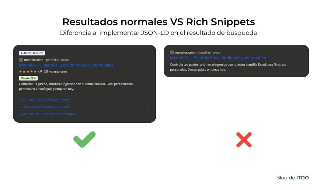 JSON-LD es esa ficha interna que no ve el usuario, pero que entienden perfectamente los buscadores. Es decir, es un formato que permite añadir información estructurada a tu web para que los buscadores la entiendan mejor. Esto no mejora directamente el ranking, pero sí como se muestra tu resultado, y en consecuencia, su CTR.