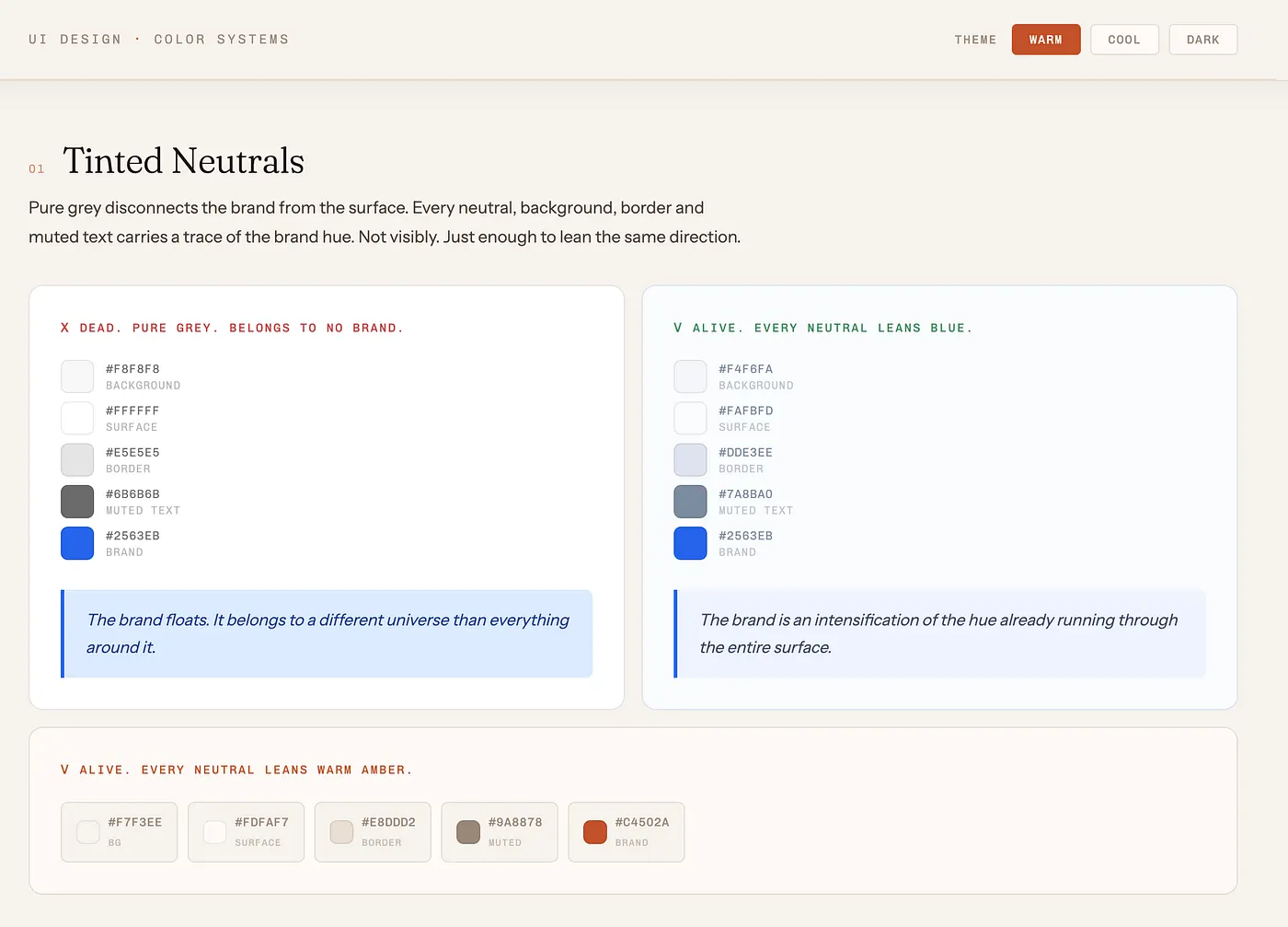 En lugar de usar una escala de grises genérica, debemos generar nuestros neutros mezclando el color de marca con la escala de grises.