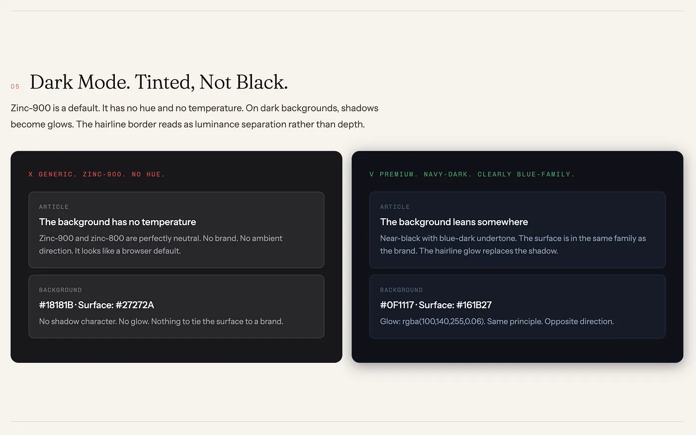 El modo oscuro no consiste en poner un fondo negro (#000000). Al igual que en el modo claro, el fondo debe ser un tinte oscuro. Un azul profundo (#0F1117) o un gris azulado genera una sensación de profundidad y elegancia que el negro sólido no puede replicar. En este escenario, las sombras dejan de ser sombras para convertirse en sutiles "resplandores" (glows) que definen las elevaciones.