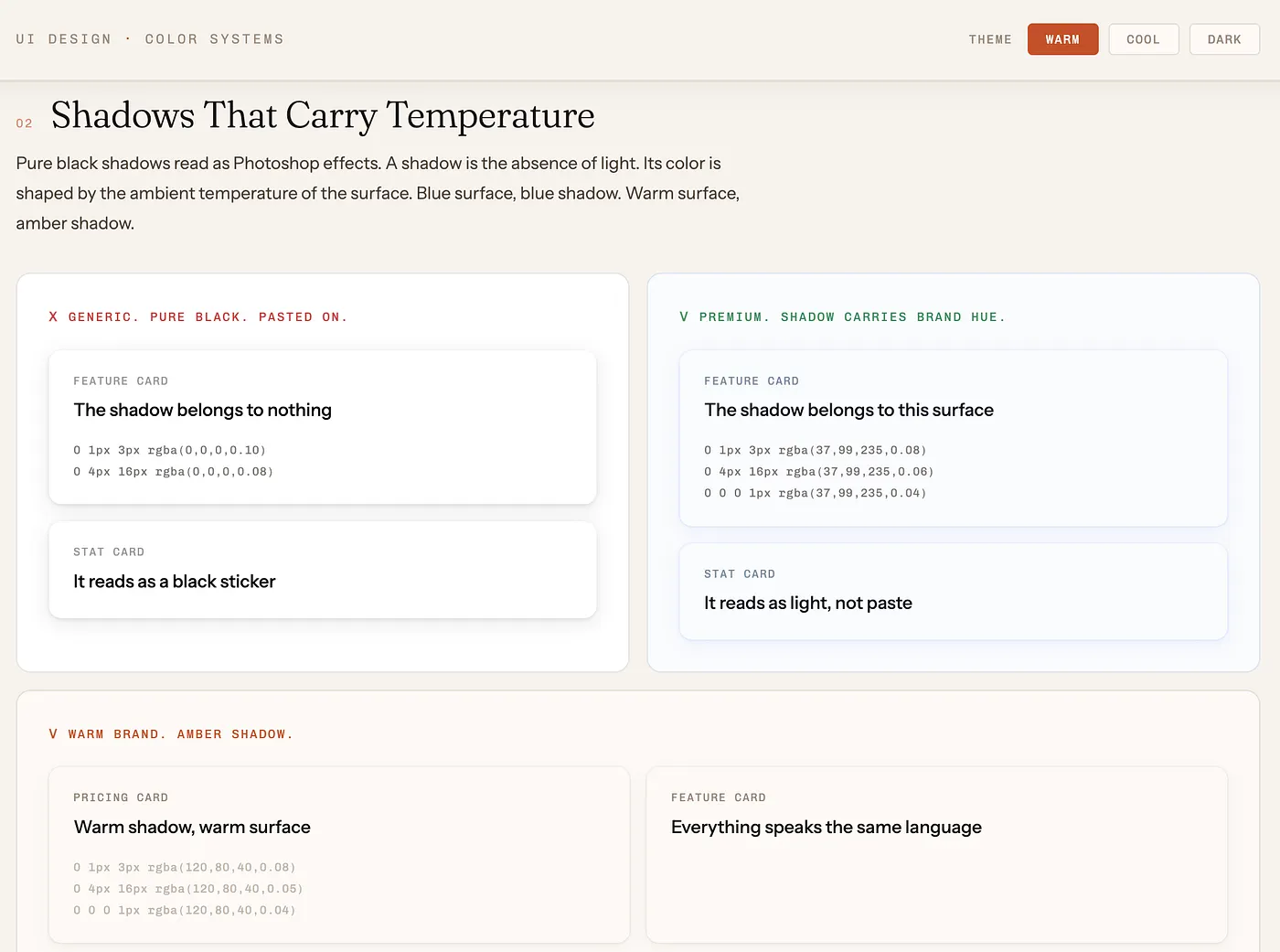 - En una interfaz de tonos cálidos, la sombra debe virar al ámbar o marrón oscuro.
