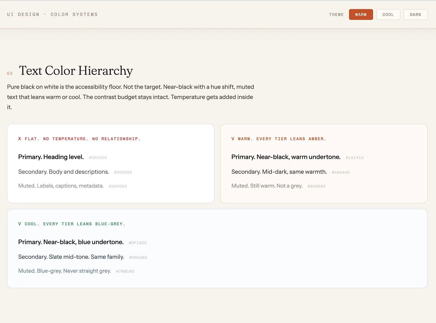 Si quieres elevar el nivel de tus proyectos de UI, aplica estas tres reglas, prohíbe los neutros puros, ni #FFF ni #000, todo debe tener un rastro (aunque sea un 1%) de color. Sincroniza las sombras, que la sombra "herede" la temperatura de la marca. Tinta los estados interactivos, los hovers y focus deben ser versiones saturadas o sutiles del color de marca, nunca capas grises planas.